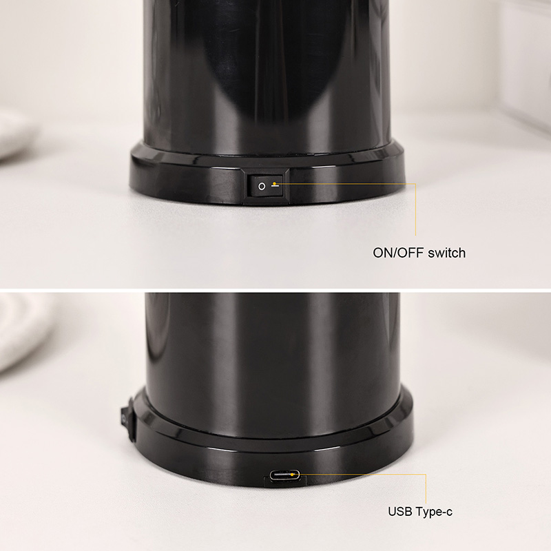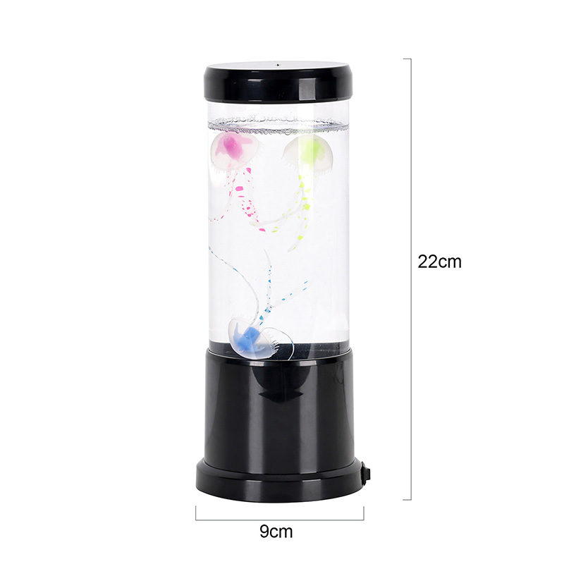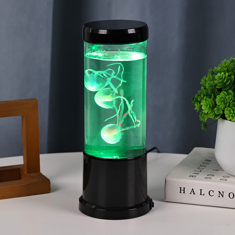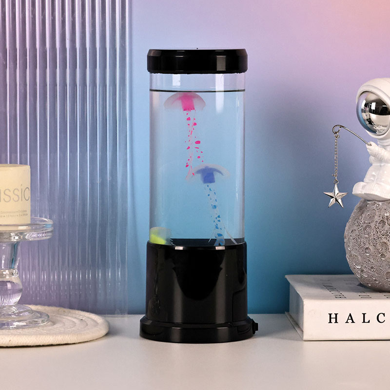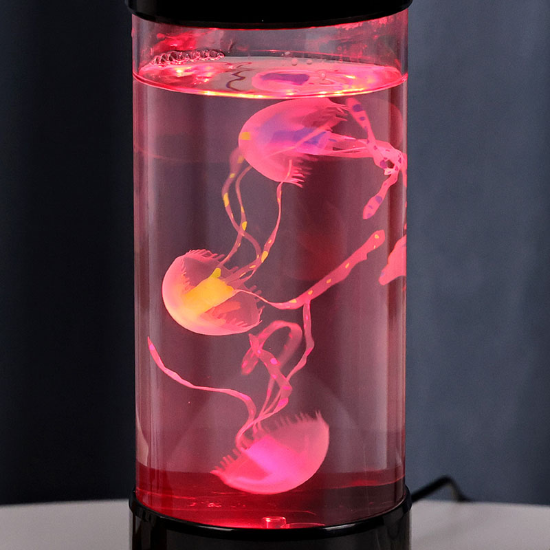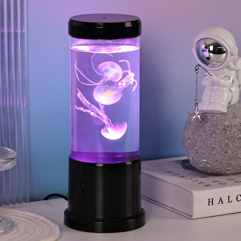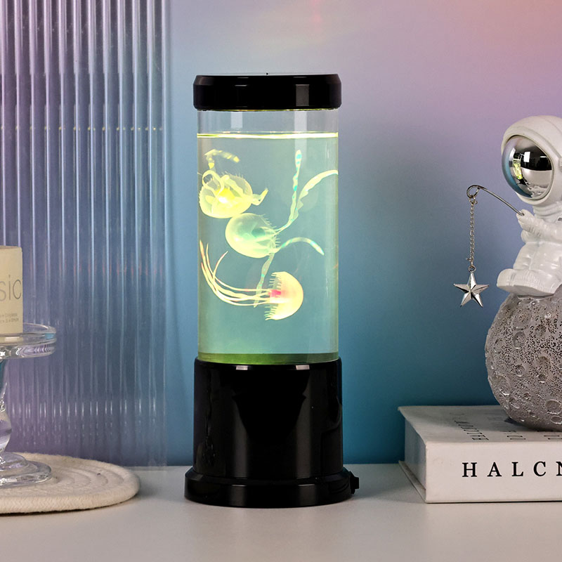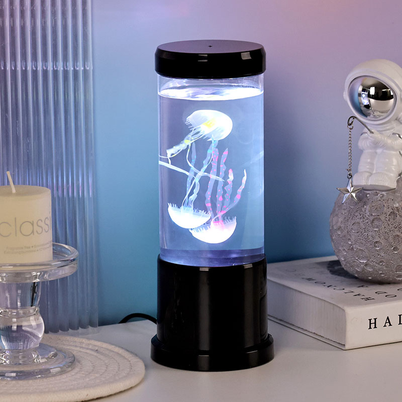 Lampa prezintă o lampă de meduze cu umbră neagră, reală, care plutește ușor într-un rezervor cilindric clar, creând o ambianță subacvatică liniștitoare care transformă orice cameră într-un refugiu oceanic senin.