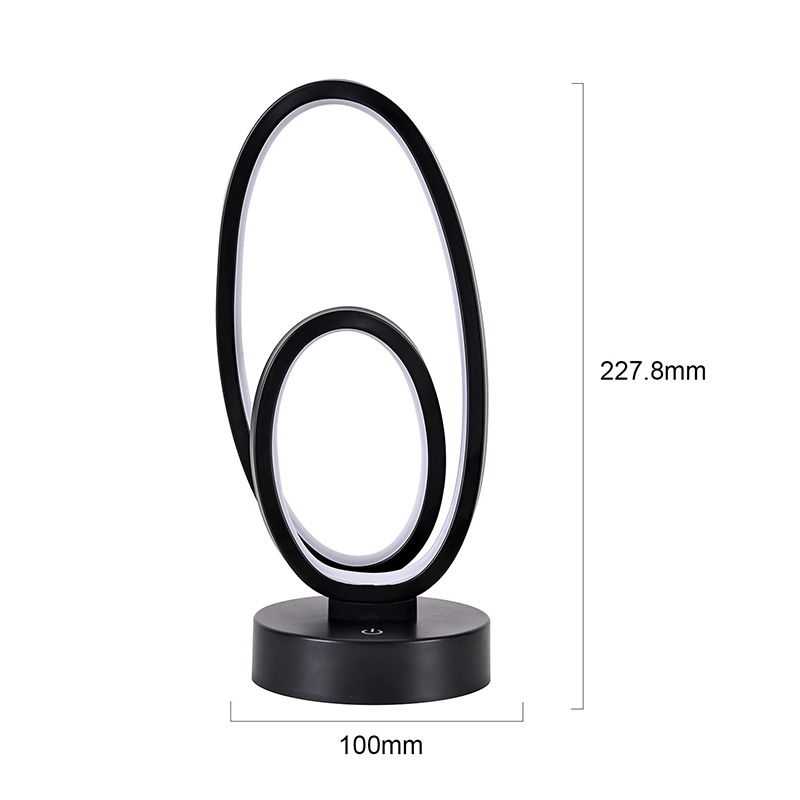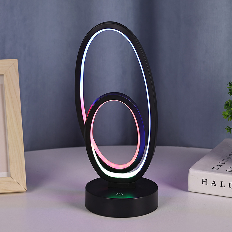 44*33*H23.5cmLampa de birou RGB cu abajur dublu circular are un design cu inel dublu, cu contururi elegante conturate de linii minimaliste. Combinând metalul și plasticul de înaltă calitate, se mândrește cu o textură excepțională și o atingere delicată. Dincolo de a fi un instrument de iluminat, acesta