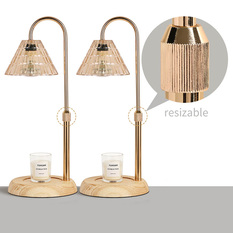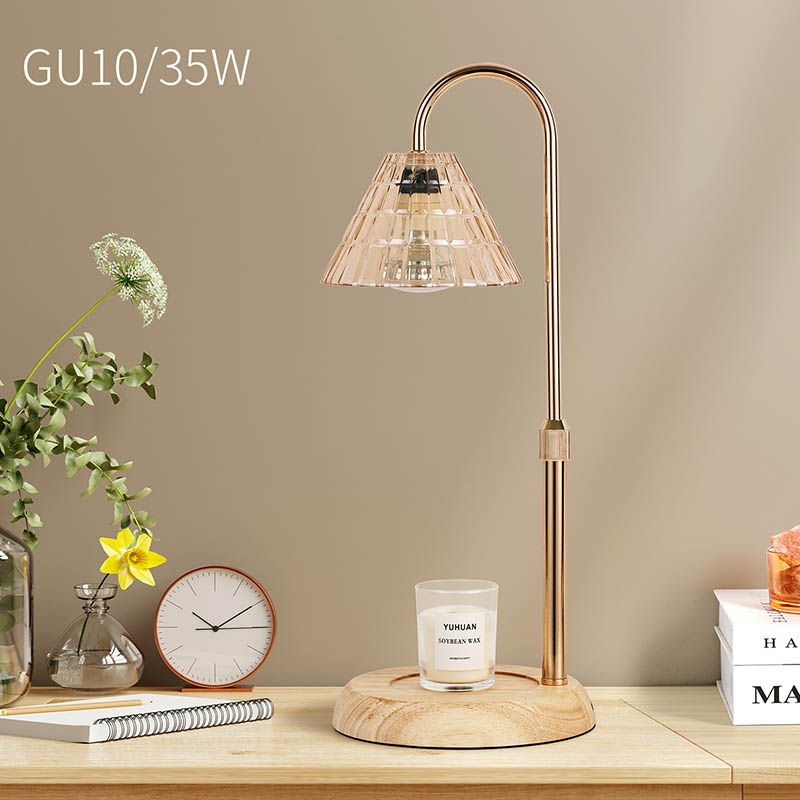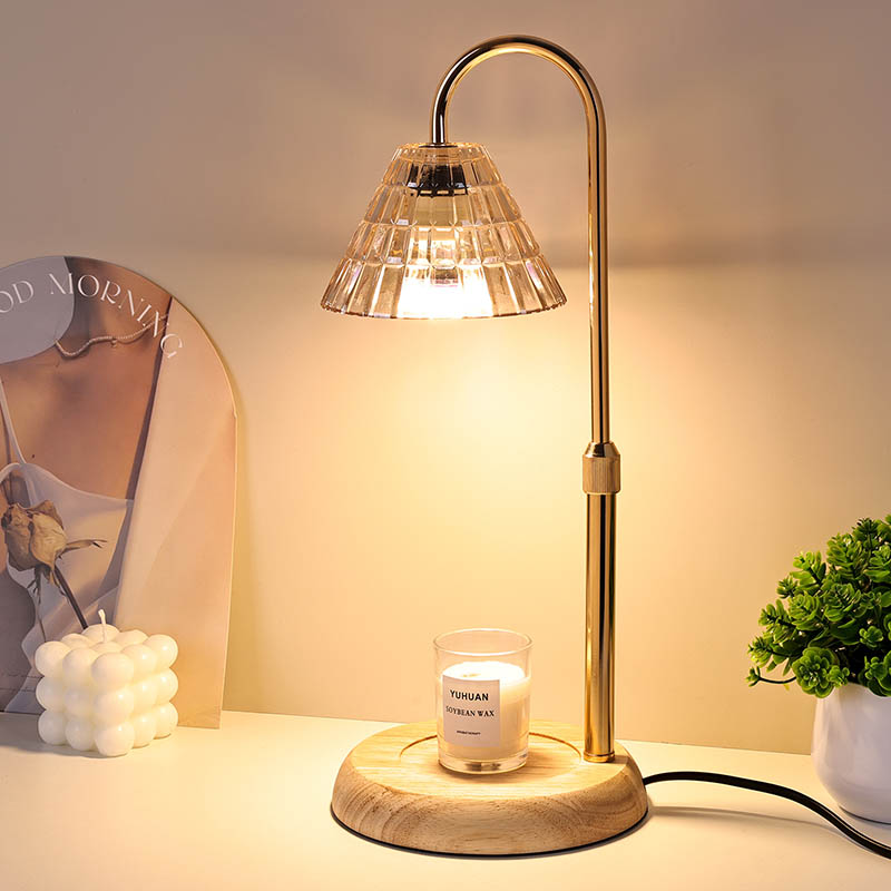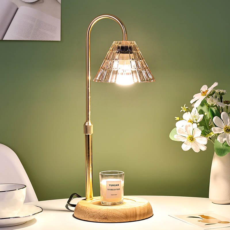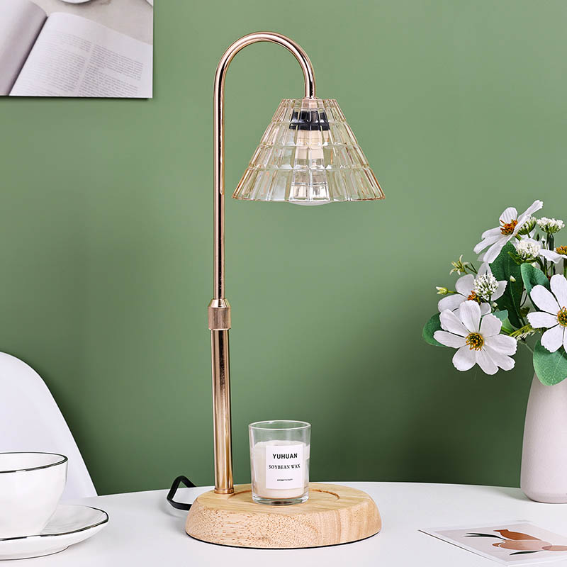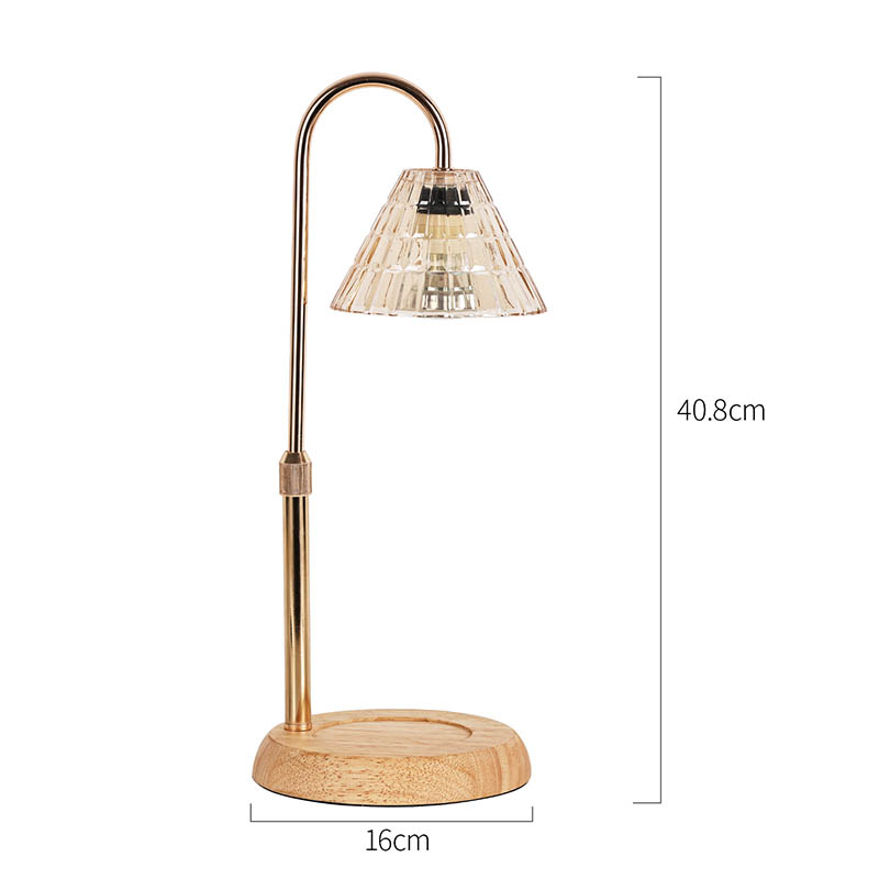 Lampa de masă cu abajur din sticlă cu înălțime reglată este un stil de design tradițional, constând dintr-un bec tradițional cu o bază din lemn și un stâlp de lampă din metal auriu.