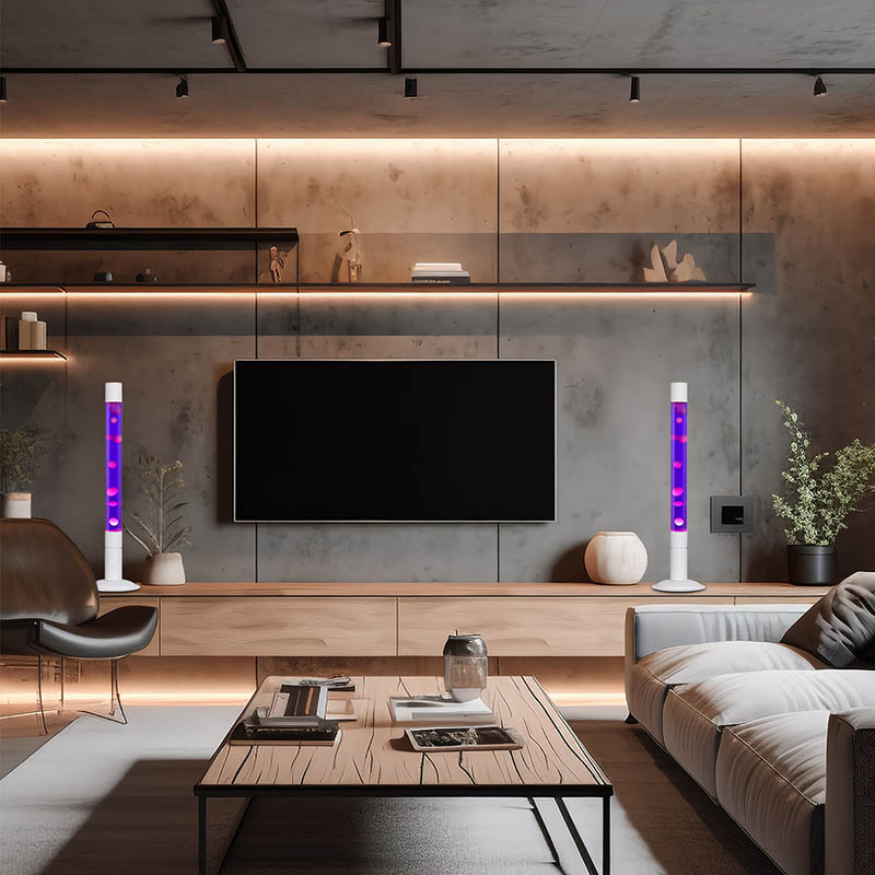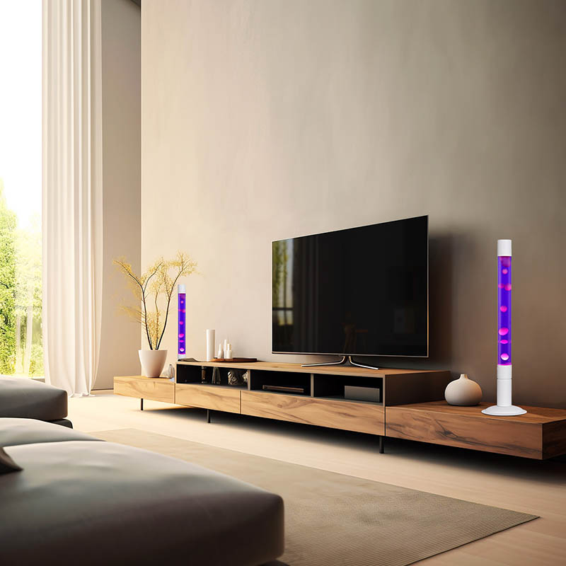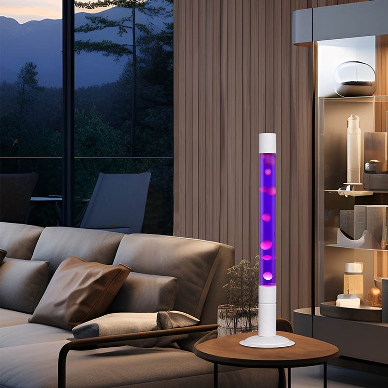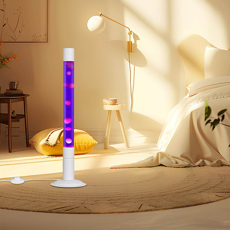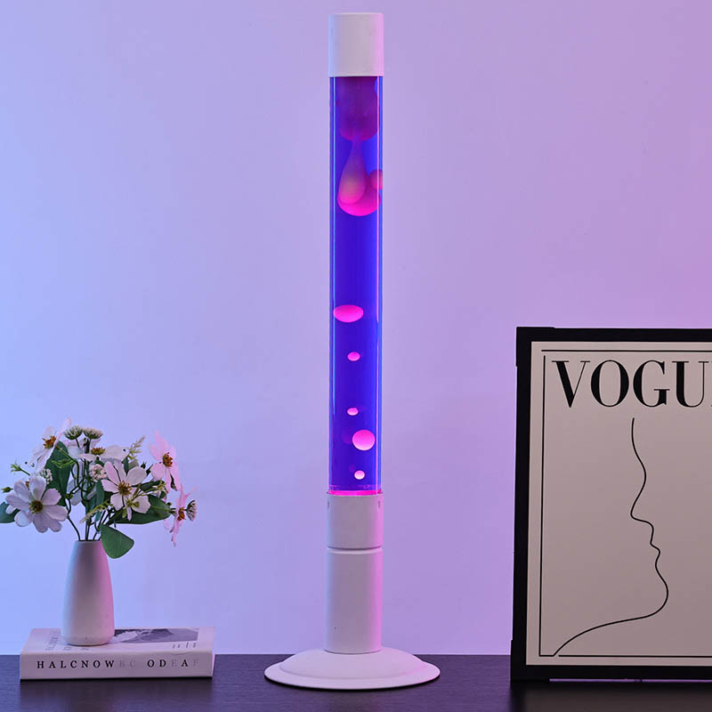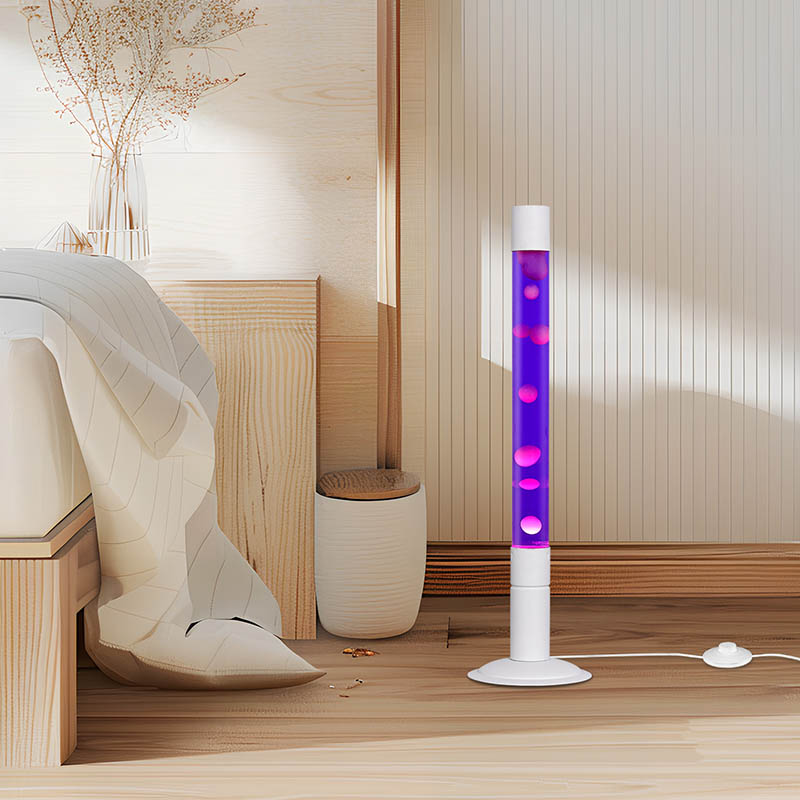 Adevărata inimă a acestei lămpi se află în caracteristica sa centrală: un tub lung, transparent de sticlă, umplut cu lichid violet fascinant. Acest lichid, care amintește de o lagună liniștită la amurg, strălucește sub lumină, creând o atmosferă calmantă și enigmatică. În interiorul acestui tub, o serie de bile roz și violet plutesc cu grație, mișcările lor blânde captivante privind spectatorii și adăugând un element dinamic la forma statică a lămpii.