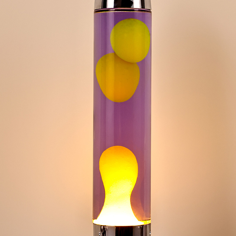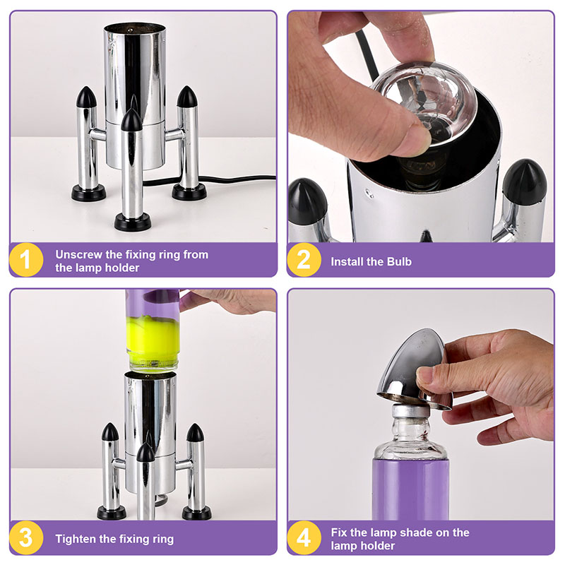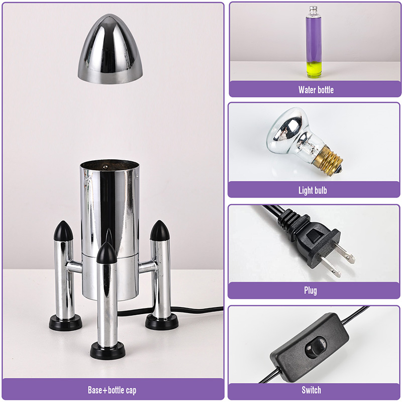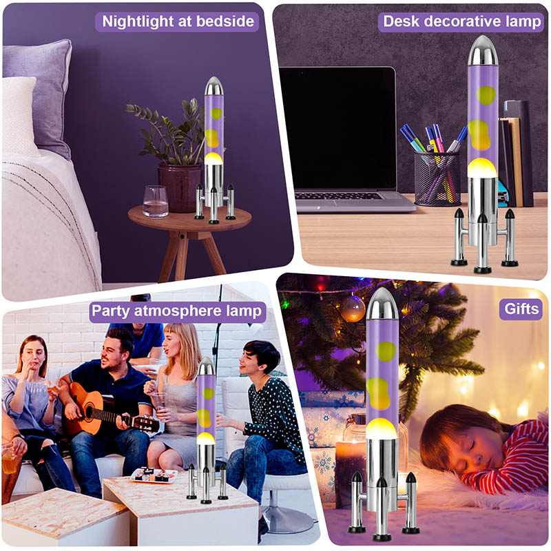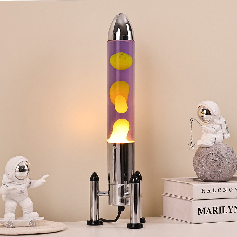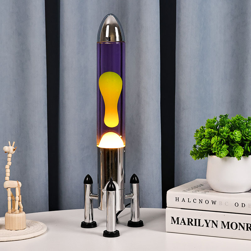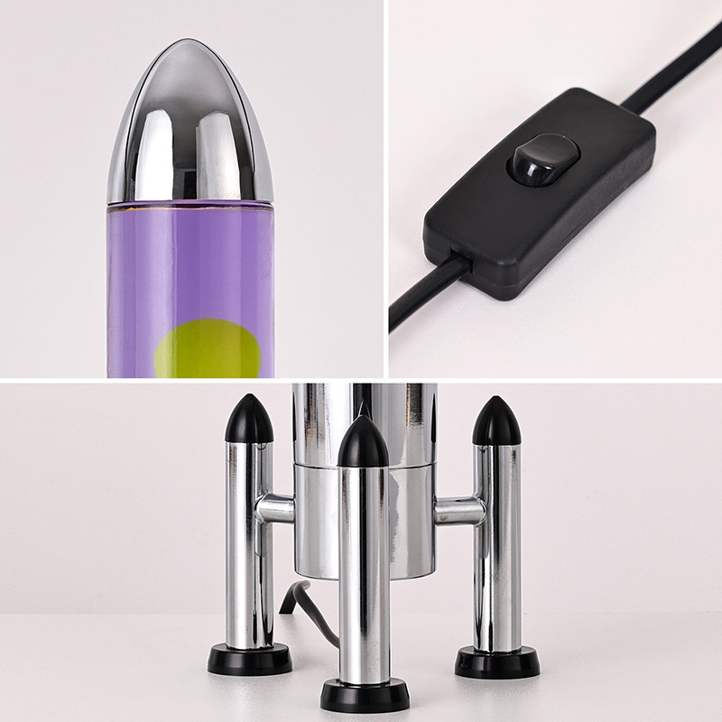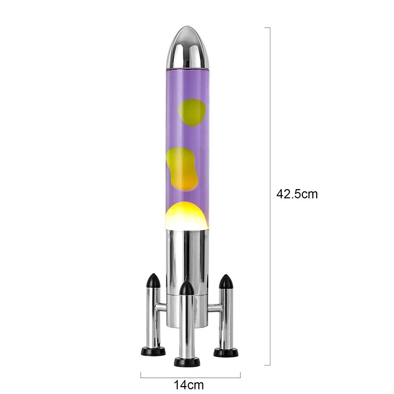 24VLampa mare cu LED Lava cu abajur rachetă are un design clasic în formă de rachetă, cu o carcasă metalică argintie asociată cu un corp de sticlă transparentă, simplă, dar elegantă. Galbenul plutește în lichidul violet din interior