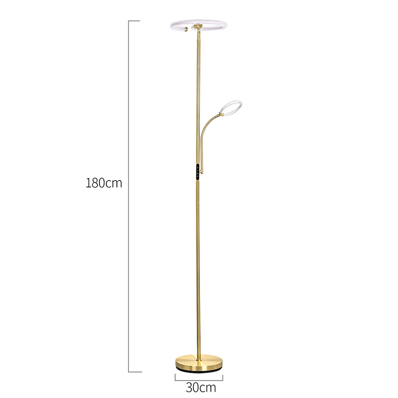 Lampa de podea cu LED Gold de lux pentru sufragerie este realizată din material metalic auriu de înaltă calitate, cu un design general simplu, dar luxos. Materialul metalic a fost fin lustruit și tratat, cu o suprafață netedă și delicată și un luciu moale, prezentând o atmosferă nobilă și elegantă. Indiferent dacă este plasat în sufragerie, dormitor sau