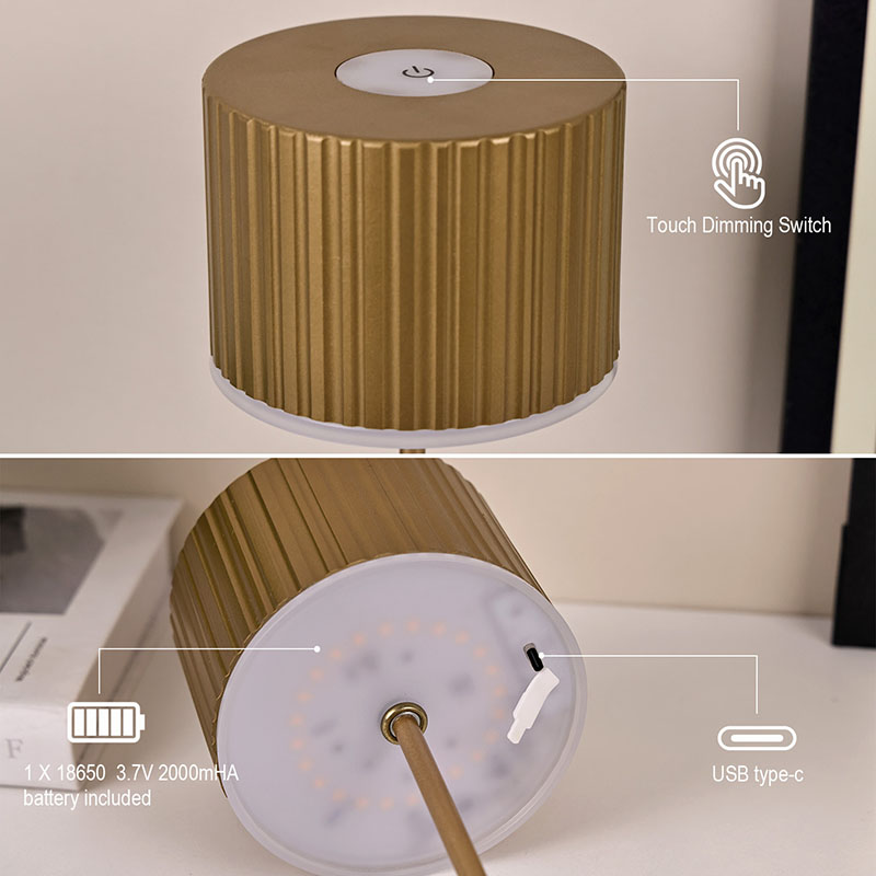 Comutator tactil (încărcare de tip c)Pentru a satisface nevoile de iluminare ale diferitelor scenarii, lampa de masă mică cu abajur din metal cu baterie este echipată cu funcție avansată de reglare cu 3 viteze. Cu operațiuni simple, puteți regla liber intensitatea luminii.