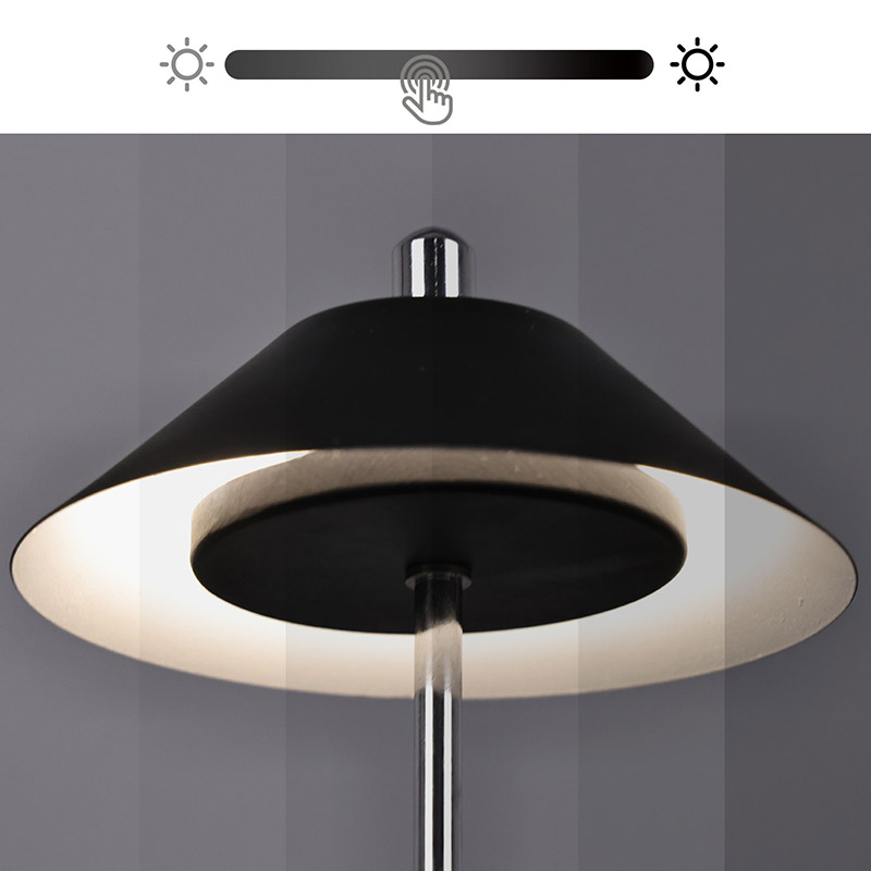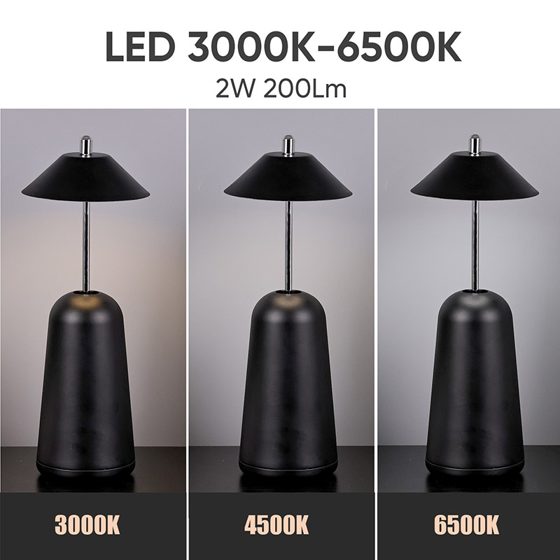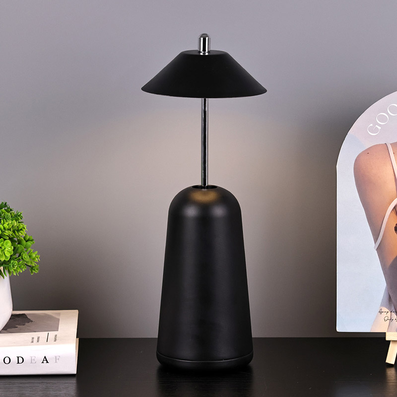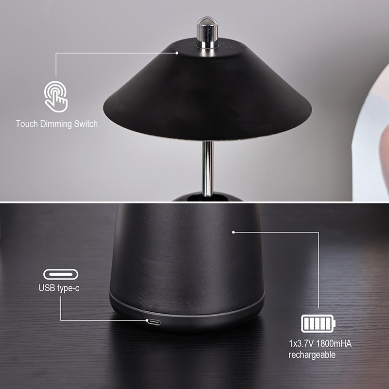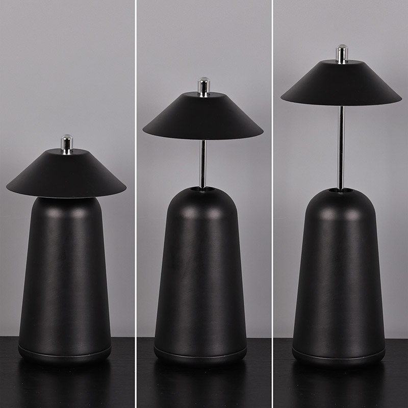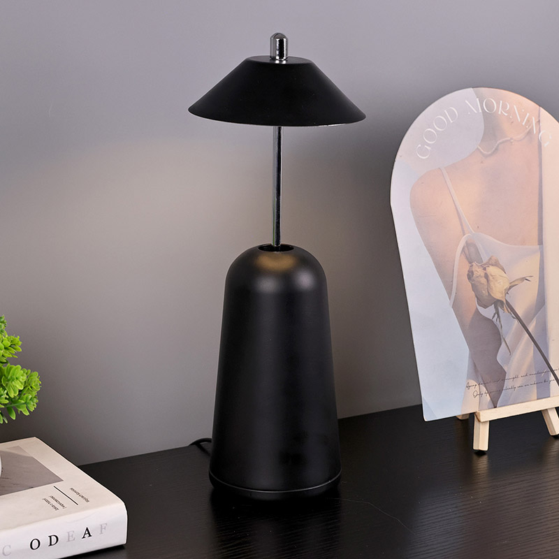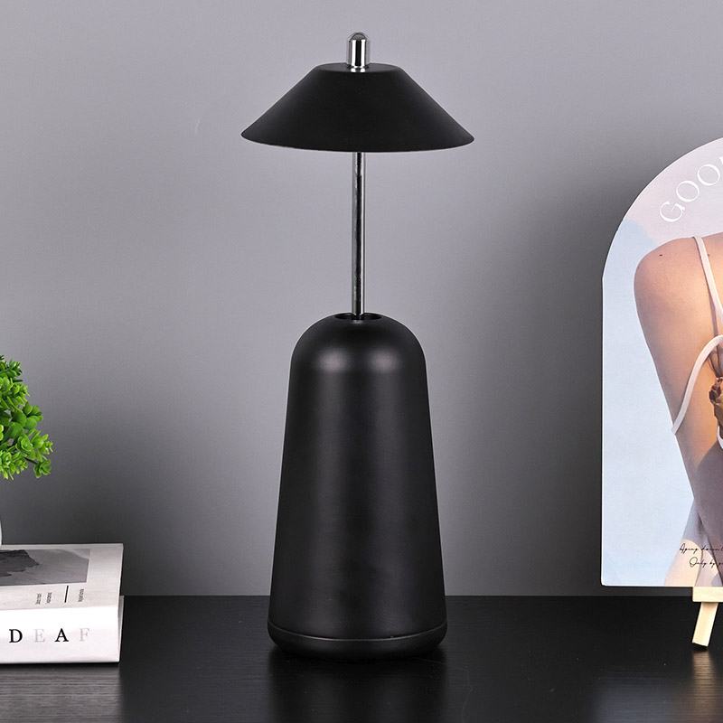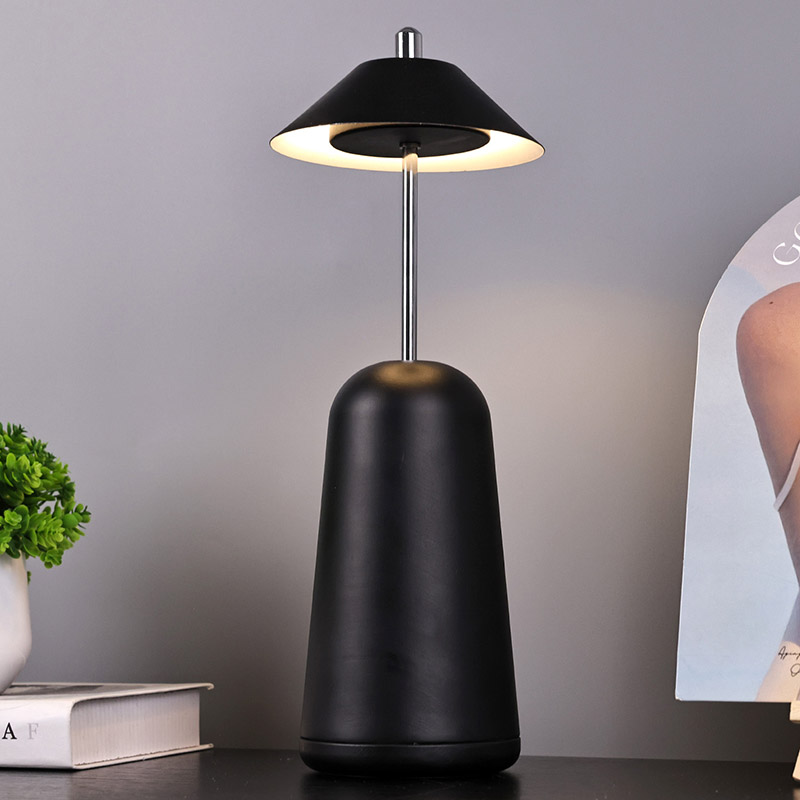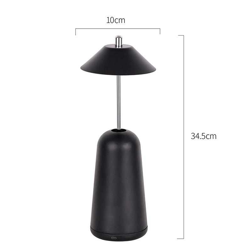 Lumina lămpii de birou moderne cu LED cu umbră de înaltă ajustare este tăiată în interiorul abajurului, cu culori calde și trei niveluri de intensitate a luminii variind de la 3000K la 6500K. Partea superioară a abajurului este un comutator tactil, similar cu o antenă. Baza este compusă din metal cilindric neregulat