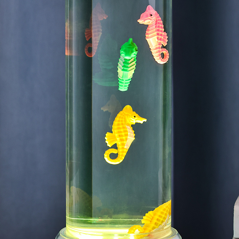 Scenă subacvatică fascinantă care evocă liniștea oceanului Întreaga unitate este realizată din plastic durabil de înaltă calitate, asigurând stabilitate de siguranță și performanță de lungă durată. Lampa are o înălțime de aproximativ 12 inci, cu un tub elegant, transparent, plin cu fluid non-toxic și ornamente colorate de căluți de mare. Fiecare căluțe de mare este realizată cu atenție, cu atenție la detalii, cu texturi vibrante într-o coloană lichidă și liniștită. sistem de circulație internă care creează o mișcare naturală de balansare asemănătoare vieții marine reale. Această mișcare blândă este liniștitoare de urmărit și ajută la reducerea stresului, oferind în același timp o experiență vizuală liniștitoare