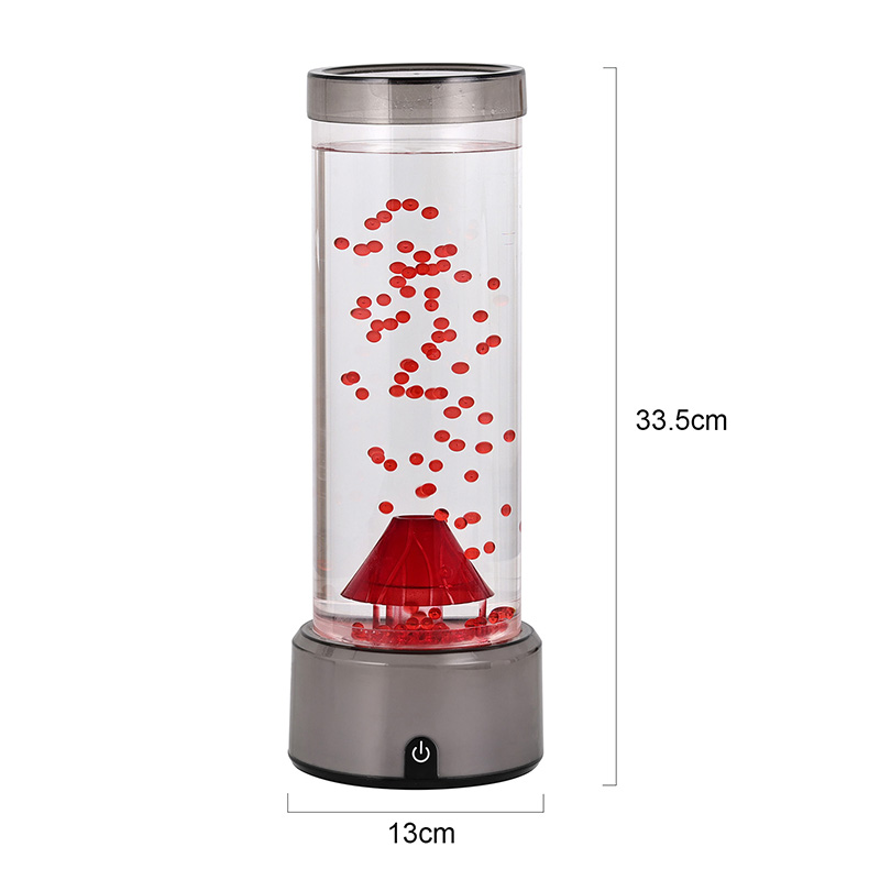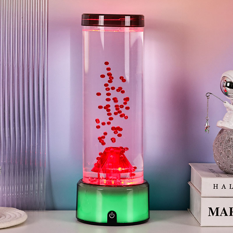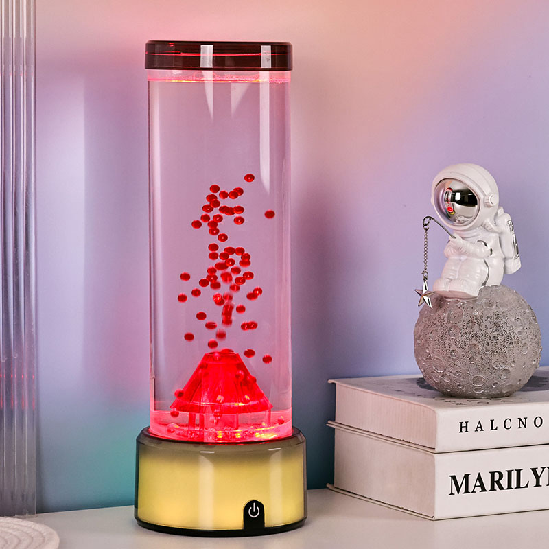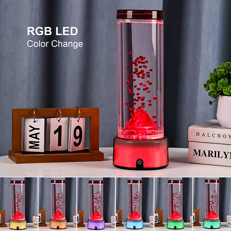 Proiectată cu o atenție meticuloasă la detalii, această lampă cu LED în formă de vulcan are o cameră cilindrică de lichid umplută cu fluid limpede și particule roșii plutitoare care simulează o erupție vulcanică atunci când este activată. Baza lămpii strălucește cu lumini RGB vibrante, care schimbă culoarea, în timp ce structura vulcanului central pulsa cu iluminare de foc, mimând o erupție reală. În același timp, decorațiuni delicate asemănătoare meduzelor plutesc grațios în coloana de lichid, adăugând o ambianță subacvatică suprarealistă. Împreună, aceste elemente creează un spectacol vizual fascinant care combină puterea naturii cu eleganța designului modern. Design și atracție estetică Lampa Vulcan care schimbă culoarea RGB are o înălțime de aproximativ 12 inchi, făcând-o ideală pentru așezarea pe birouri, noptiere, rafturi sau ca o piesă decorativă izbitoare în camere de zi, dormitoare sau chiar în săli de clasă. Silueta sa elegantă și modernă prezintă un tub cilindric transparent realizat din plastic de înaltă calitate, rezistent la spargere, asigurând durabilitate și siguranță. Capacul superior este sigilat în siguranță pentru a preveni scurgerile, în timp ce baza este realizată din plastic neted, finisat mat, cu un panou de control încorporat.