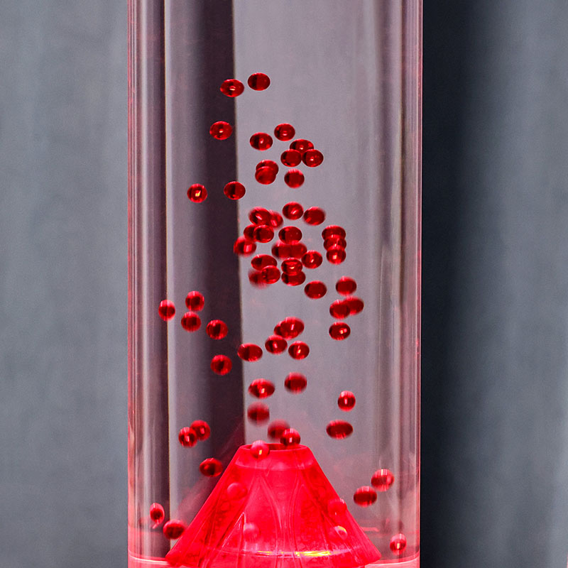 În centrul lămpii se află un model de vulcan în miniatură, conceput complex pentru a semăna cu un adevărat con vulcanic. Când este pornit, vulcanul începe să „erupă”, trimițând particule de culoare roșie în sus prin coloana de lichid într-o mișcare continuă, ritmică. Aceste particule, suspendate într-un lichid netoxic special formulat, se ridică și cad ca bulele de lavă, creând un efect hipnotic care amintește de un vulcan activ. Mișcarea este condusă de un mic sistem intern de pompă, care circulă lichidul ușor, dar constant, asigurând performanțe de lungă durată fără supraîncălzire.