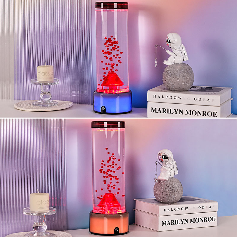 Beneficii de mediu și emoționale Dincolo de atractivitatea sa estetică, Lampa Vulcan care schimbă culoarea RGB contribuie pozitiv la bunăstarea mentală. Studiile au arătat că expunerea la lumină ambientală slabă poate scădea nivelul de cortizol (hormonul stresului), poate îmbunătăți starea de spirit și poate îmbunătăți concentrarea. Mișcarea ritmică a particulelor și a meduzelor creează un efect meditativ similar cu vizionarea lămpilor cu lavă sau a acvariilor, promovând conștientizarea și echilibrul emoțional.
