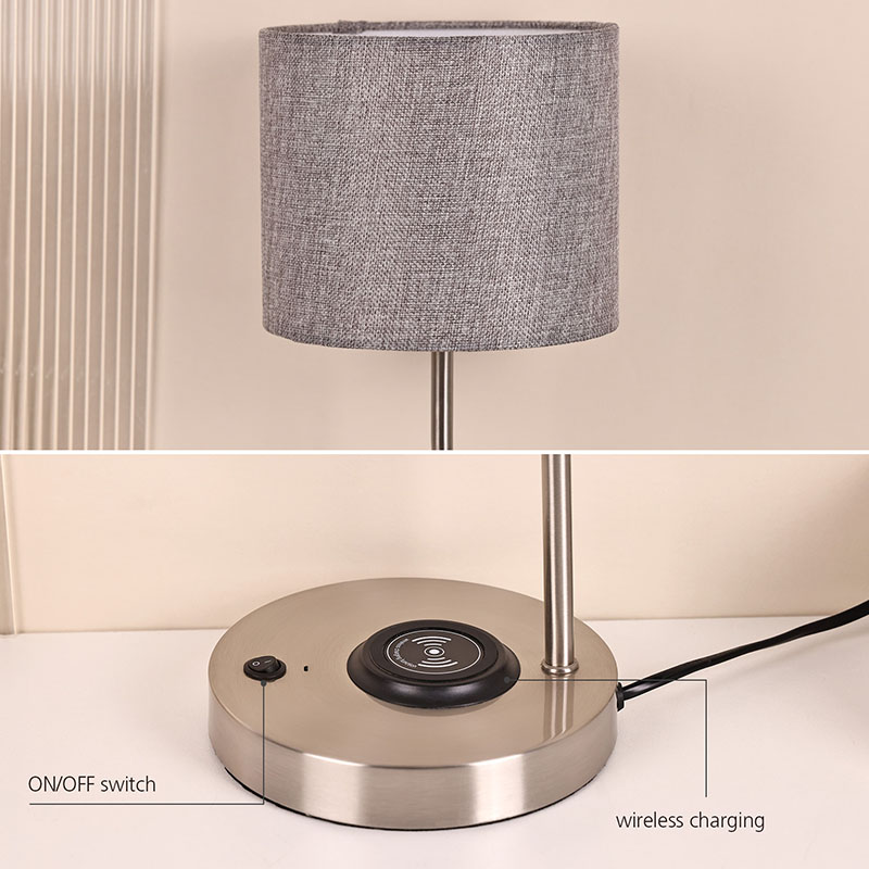 Comutator ON/OFF pe bazăLampa de birou pentru încărcător de telefon fără fir cu abajur din țesătură adoptă un design de husă din pânză de înaltă calitate, cu țesătură delicată și moale, textură clară și naturală, oferind oamenilor o senzație caldă și confortabilă. O husă de pânză nu numai că poate difuza în mod eficient lumina, făcând lumina mai moale și mai uniformă, dar și reduce strălucirea și iritația ochilor, protejându-ți vederea. Husa din pânză gri are o nuanță de culoare simplă și elegantă, care se poate îmbina perfect cu diverse stiluri de decorațiuni interioare, creând o atmosferă caldă și elegantă